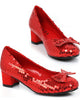 These Red Dorothy Girls Shoes are essential for completing your Dorothy costume for Book Week or your next Wizard of Oz party. The shoe is embellished in ruby red sequins just like Dorothy's from the movie and features a little sequined bow on the toe and a short and solid red block heel. Just click your heels three times and say "there's no place like home" for the complete Dorothy cosplay.