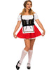 This gorgeous and absolutely flattering Greta Oktoberfest Beer Maid Womens Plus Size Costume will have you serving up fountains of beer to bar patrons this Oktoberfest. The costume comes with a mini dress that features a mock white shirt with puffed short sleeves that expose the shoulders. The top part of the dress also features an attached underbust corset over the top of the shirt in black that laces up and features a colourful patterned trim. The skirt of the dress is a bold red colour and features two attached layers of an underskirt petticoat for added volume and comes with a detachable white apron featuring the same patterned trimming as the dress. To complete the look, a All you need now is a tray of beer and you're all set!