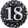Welcome your friend or loved one to adulthood with this 18th Sparkling Holographic Standard Foil Balloon. The balloon features the number 18 and the words 'Happy Birthday' written in silver with a holographic finish and an attractive border of white and gold holographic dots and stars on a black background.