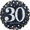 Celebrate the big 3-0 with this 30th Sparkling Foil Multi-Balloon. It measures 81cm and features a glamorous round balloon decorated in gold and silver on a black background. A silver '30' balloon is attached to the front, hence it's called a multi-balloon.