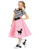This Poodle Skirt for girls is a '50s themed party classic! This pale pink knee-length skirt has a full, free-swinging shape to it and is made from a fleece like fabric. There's a cute poodle patch on the front complete with a leash made with gold sequins.