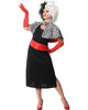 The infamous villainess of the movie 101 Dalmatians made it her mission to snatch puppies to turn into cruel couture. This Disney Cruella De Vil Womens Costume features a shin-length slip on black dress with a slit on the left and a wide red elasticated belt with velcro fastening. The detachable short cape has a dalmatian pattern which instantly gives that infamous look to the costume, fastens with velcro and has a red 'jewel' embellishment at the closure. Red elbow length gloves are included (although these come up quite small) together with the telltale black and white wig - which will give you a really bad hair day!