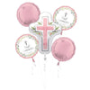 Each pack contains white, Nude & confetti 5 x 12in Christening balloons.
