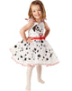 Look as cute as a puppy at your next fancy dress event in this gorgeous 101 Dalmatians Girls Costume. This classic costume includes a white tutu style dress with an image of a cute puppy on the front, adorable black spots on the skirt, red waistline with a bow in the middle and red trim on the hem. Watch out for Cruella!