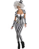 For a frisky fright, this film favourite has been adapted into a sassy and spooky women's version of the Beetlejuice fancy dress costume. This costume comes with a black and white striped tutu pullover dress with gold button and chain detail, beetle juice logo on the front bottom left and attached white petticoat underneath. A messy silver synthetic wig and velcro-fastened white collar with attached short black tie complete the transformation.