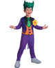 Become Batman's greatest nemesis with our Classic Joker Boys Costume. The awesome supervillain costume design is adapted from the classic incarnation of the DC comics character the Joker. The costume features a digitally printed long sleeve jumpsuit with an attached foam yellow flower brooch and green tie. The jumpsuit is styled as a digitally printed purple suit with a printed orange vest and a tailcoat just like the in comics! In addition, the costumes features attached grey boot covers and a green 2D headpiece with an attached black elastic to complete the look!