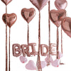 Each pack contains 55 balloons: 1 x 18in, 6 x 12in, 4 x 10in, 3 x 5in Pink balloons, 7 x 12in, 4 x 10in, 3 x 5in Dusty Pink balloons, 1 x 18in, 8 x 12in, 5 x 10in, 3 x 5in White balloons, 5 x 12in White Balloons, with text reading 'Future, Mrs', 'Team Bride' ,' Bride To Be' and 'Hen Party' , 5 x 12in Confetti Balloons, 150m of Pink, Peach and White Streamers, 3m x paper balloon tape, 70 x glue dots, 3m x white jute twine included for easy assembly.