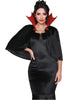 You'll look like a villainous vampire using this Fever Vampire Cape and Gloves Set! This set includes a short black cape with a red turned-up collar and gold trim and a pair of black gloves with a faux-ruby embellishment. The cape ties up at the neck and additionally features faux black pearls and a faux ruby clasp. Adding elegance to evil!