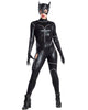 A modest version of the more daring flesh exposing Prowling Catwoman Womens Costume. Black vinyl pantsuit with flesh coloured top half with black sleeves, belt and cross over Catwoman straps. Mask included.