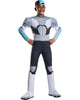 DC Comic's Teen Titans are ready for their Cy to join the fray with this Teen Titans Cyborg Deluxe Boys Costume. Inspired by the Cyborg from the Teen Titans Go! TV series, this costume is a full-length jumpsuit featuring digitally printed chest panels, sleeves and knee pads, as well as including foam-backed shoulder pads for a more robotic shape and foam-backed boot covers so your child can wear their comfiest shoes and still look the part. To complete the costume, a moulded plastic half face mask is included and has painted features, sits over the left eye with an elastic band securing around the back of the head. Perfect for any Superhero party, Book Week and more.