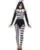Don this Killer Clown Mens Costume and you'll surely cut out the laughter! Spooky little number that'll be ideal for the next horror or Halloween party. A striking black and white jumpsuit with stripes on one side and large spots on the other, a big black frilled collar around your neck and a horror mask with hat attached. Slip on some not so funny clown shoes and a pair of white gloves for a nightmarish Halloween costume. A clown with a difference.