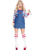 Don't just leave me on the shelf, don't you want to play with me? This cute and creepy Wind Up Doll Womens Costume is the perfect costume for Halloween if you don't want to be completely scary but also want to be cute as well! The costume comes with a blue dolly dress featuring puffed sleeves, black lace trimming, patch detailing and a polka dot tulle under layer, an attached silver wind up key and a black bow headband. Add some blood or extra makeup and a toy knife to turn yourself into a scarier killer doll for Halloween!