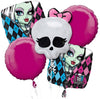 Have a frighteningly good party with this Monster High Foil Balloon Bouquet of 5 balloons. The bouquet features one skull-shaped ballon with a bow, two square-shaped balloons with Frankie Stein and the Monster High argyle print and two plain round fuchsia balloons.