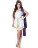 This Grecian Toga Womens Costume is the perfect look for a Toga Party! This costume includes a white and gold toga dress with a purple velvet shoulder drape and gold rope belt.