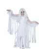 Your girl will look haunting this Halloween in the eerie Ghostly Girls Costume. This costume comes with a white mesh overdress with flowing fabric strip sleeves and a detachable hood, a white under dress and a brooch to complete the look.