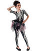 Give your skeleton some style in this Skelee Ballerina Girls Costume. The costume features a black jumpsuit with a white skeleton print and an off the shoulder top. The tutu skirt features layers of grey, pink and black, with a black belt and diamonte buckle to complete the look.