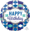 Celebrate someone special with this Happy Birthday Primary Patterns Supershape Foil Balloon. The balloon is blue with a silver border and a colourful triangular pattern surrounding the Happy Birthday message.