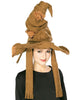 This is the officially licensed Harry Potter Sorting Hat with adjustable elasticised velcro tab inside for adult to child fit. The hat is tall and brown with a sagging tip and patchwork throughout. There are also two long brown strands coming down from either side of the hat.