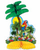 Complete your Hawaiian themed party with this Tropical Island Centrepiece. This bright and colourful centrepice features a paper palm tree surrounded by island plants and wild life on a yellow honeycomb base.
