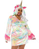 Instantly become a magical unicorn with our Enchanted Unicorn Women's Plus Size Costume. A fantastic women's costume great to add to your wardrobe this Halloween. Features a vibrant rainbow hooded jacket, with a working zipper and can work well as a dress! The hood features a golden horn, pink ears and pink tassels resembling a unicorns thick mane!
