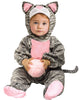 For a purrrfect look this Halloween, you little one will love this Grey Stripe Kitten Baby Girls Costume. This adorable costume features a grey jumpsuit with purple tiger stripes and matching attached tail, matching hood with cats face and pink ears and attached mittens. This cute costume will keep your little one warm and cosy.