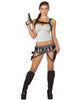 This Treasure Huntress Womens Costume is super simple but sexy. Over the top of a light grey tank top and dark grey mini shorts, the costume comes with a backpack, which fastens in the front, and a cute belt with gun holsters and 4 mini toy grenades. Great for your next dress up party or even Halloween!