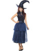 Become a witch of the night with our Deluxe Midnight Witch Womens Costume. Practice witchcraft this Halloween while wearing our fantastic Witch costume! Featuring a dark blue dress with a sparkling blue top, a blue jewel like brooch and a belt tied in a bow tie around the back and the skirt features two layers of ruffled lace material with a long blue petticoat underneath. To complete the costume we include a long blue witch's hat for that bewitched look!