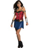 Channel Wonder Woman's power and bravery with this Justice League Classic Wonder Woman Womens Costume. Including everything but the boots, this costume comes with Diana's tiara, the red bodice with blue skirt as seen in the Justice League movie, as well as armband and gauntlets. The perfect costume for any Superhero!