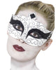 Don this great quality Lorenzo Black and Silver Masquerade Mask and add an air of mystery to your look. The mask is made of hard moulded plastic with silver filigree detailing at the top and bottom. The mask fastens at the back with a black ribbon tie. Add a black or silver cape for some serious drama!