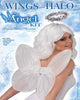 Simple and inexpensive White Angel Kit consisting of a silver tinsel halo on a headband and a pair of white fine net wings with silver glitter decoration. The wings have shoulder straps for easy wear. Great for school nativity plays, general dress up or fairy and angel costumes.