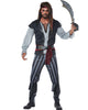 Be the baddest pirate in all the land with this Scallywag Pirate Mens Costume. This costume comes complete with a long sleeve grey blud with an attached black vest, black and grey striped pants, black boot tops, a plush velour maroon waist sash, a black belt and a maroon head tie.