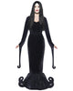 Transform into the Matriarch of the Addams Family in this Morticia Duchess of the Manor Womens Costume. This costume comes with a tight fitted, velvet effect v-neck black gown with draping long sleeve tentacles and an attached detailed hem with spiralled tentacles.