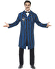Transform into the Patriarch of the Gothic Manor House in this Gomez Duke of the Manor Mens Costume. This costumes comes with a long blue and black striped jacket with an attached white mock shirt, black bow tie, emblem on the chest, silver chain for a pocket watch and black buttons.