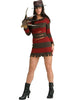 They won't want the nightmare to end when you don the Miss Krueger Womens Plus Size Costume which includes: Freddy's signature blood red and forest green sweater style dress featuring slash marks across the chest, brown fedora, and a realistic-looking Freddy glove.