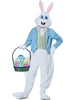 Bring joy this Easter in this Deluxe Easter Bunny Adult Costume. This high-quality costume features a plush white fur bodysuit with an attached blue and yellow striped vest and blue jacket, both with neatly hemmed edges. A matching plaid bow tie is also included. The suit has padded shoulders for extra comfort and velcro fastening at the back to make putting the costume on and off a lot easier. The bunny head has semi-transparent eyes so you can see where you are hiding the eggs without ruining the illusion for the kids. There's foam padding inside the headpiece to ensure it sits well on your head. A pair of bunny gloves and bunny feet shoe covers are also included. The large size will fit adults up to 6ft 3in and the small up to 5ft 9in.