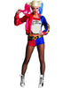Become the unhinged hellraiser in this Suicide Squad Harley Quinn Womens Costume. The costume features the red and blue bomber jacket worn by Harley in the film with an attached top that reads 'Daddy's Lil Monster'. Her blue and red sequinned mini shorts feature gold studded belt, with black fishnet tights included to wear underneath.