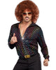 Own the dancefloor with your best moves in this Disco Dude Mens Shirt. This black button-up shirt is covered in holographic rainbow spots. This shirt will be perfectly paired with some bell bottom/flare pants, a pair of platform disco shoes and an outrageous curly wig.