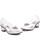 Step out in style with these White Babydoll Heels Womens Shoes. The shoes are made of a shiny white faux leather and feature a stiletto style 10cm/4in heel, an attached white strap along the top which has a small bit of elastic under the button. Additionally, within the sole of the shoe is a concealed platform for extra height - perfect for any costume or even a night out on the town!
