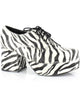 Shake it on the dancefloor in style with these Black and White Platform Zebra Mens Shoes. These dancing shoes are made of faux zebra fur with lace up front and a platform sole and heel that measures 7.6cm/3in. Boogie on down!