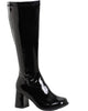 You'll be both stylish and comfortable when you wear these Black Wide Width Go Go Womens Boots. The boots are made of a black shiny faux leather and reach approximately just below the knee. The boots also feature a 7.6cm/3in heel. Perfect for any 60s or 70s costume.