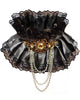 Finish off your Victorian or Steampunk themed outfit with this Victorian Ruffled Neck Collar. The collar features one large ruffled piece of silver fabric that is spilt in two sections by a black elastic in the middle, with both ends featuring black lace trimming. There is a big gold plastic flower in the centre of the collar that is the statement of the piece, with three silver chains hanging off. The collar covers most of the neck and is the perfect dramatic accessory.