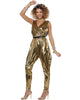 Bust a move when wearing our 70s Glitz N Glam Womans Costume. The shimmering costume is a great fancy dress idea for dancing the night away at the club or for your next 70s themed party! Featuring a silky smooth gold jumpsuit with a V neck bust line and a black sequin belt. Why not accessories with our large range of 70s accessories! You'll surely bedazzle the dance floor!