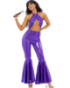Carve up a move on the dance floor in this 70s Foxy Disco Lady Womens Costume. This costume includes a red stretch fabric jumpsuit with holographic purple neckline and halter neck tie-up. The jumpsuit has rainbow metallic stripes on the red fabric as well as a tie back at the waist. The jumpsuit also flares out at the knees into a metallic purple print, and is complete with a red stretch fabric headscarf that matches the material of the jumpsuit as well as an adjustable gold circle belt.