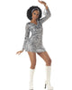 This foxy mamma is ready to dance the night away! This Disco Diva Womens Costume includes shiny sequins so you can really show of your moves on the dancefloor. This classic Go Go dress with long sleeves also has a funky black and white pattern with sequins and a matching headband. Disco Fever!