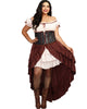 Become a saloon girl from the old west and get those dancing shoes ready when you wear this Wild West Saloon Gal Plus Size Womens Costume. Saloon girls were known for their love for music, pouring the whisker (and drinking it too) and dancing. Show off a bit of ankle and shoulder in this flattering off the shoulder style of dress. Dress features a cream off the shoulder design with a dark red velour trim and bow around the neckline, a ruffle layer skirt in the front and an attached brown floor length overskirt. A faux black leather corset straps on around your waist which zips up at the back and ties at the front like a real corset. Check out the rest of our western range and why not grab a few girlfriends and each dress as a unique saloon girl from the Wild West.